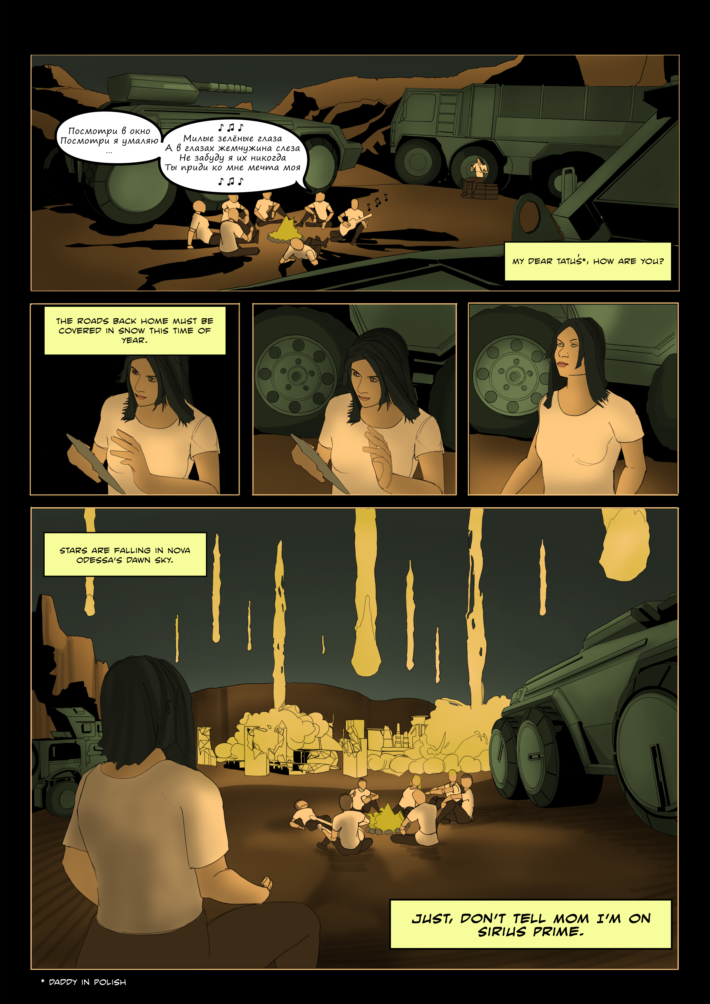The seed for this comic was planted almost a year ago when I fell down a YouTube rabbit hole and ended up stumbling upon a channel dedicated to Russian military songs. Three videos stood out and inspired the story and imagery of this comic you’re about to read. The first one is Don’t tell Mom I’m in Chechnya, which takes the form of a letter written by a Russian soldier to his sister back home, describing the horrors of the Chechen War. It is actually a reboot of an older song dealing with the Soviet-Afghan war. The second one is Beautiful green eyes by Timur Mutsurayev, which is the type of ballad that one guy with a guitar at every Eastern-European house party would play. The last one is actually a cover of Beautiful green eyes by two Russian army guys recorded on a mobile phone while they were camping in a foggy mountain pass. I highly recommend you play any of these while reading the comic to help set the mood.