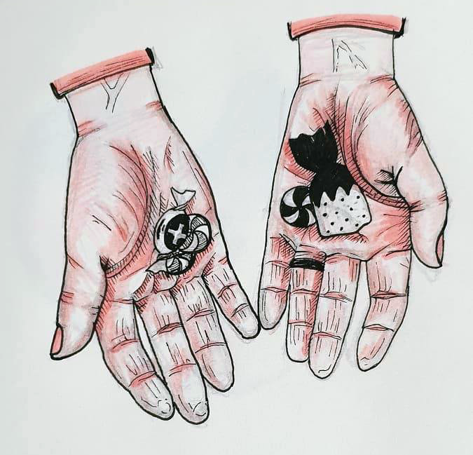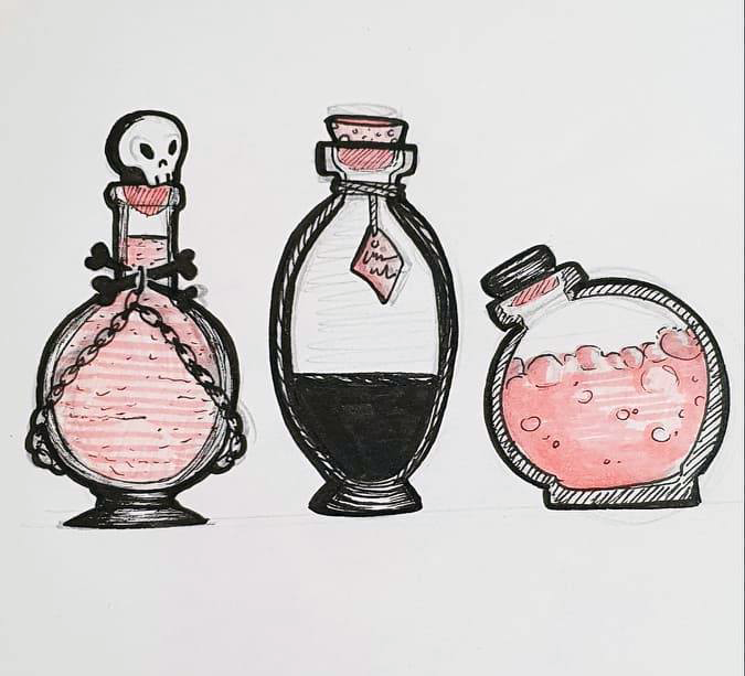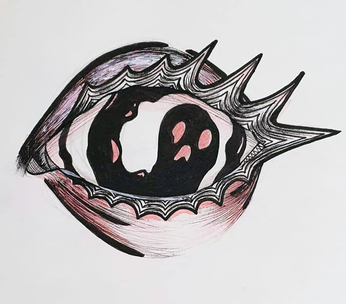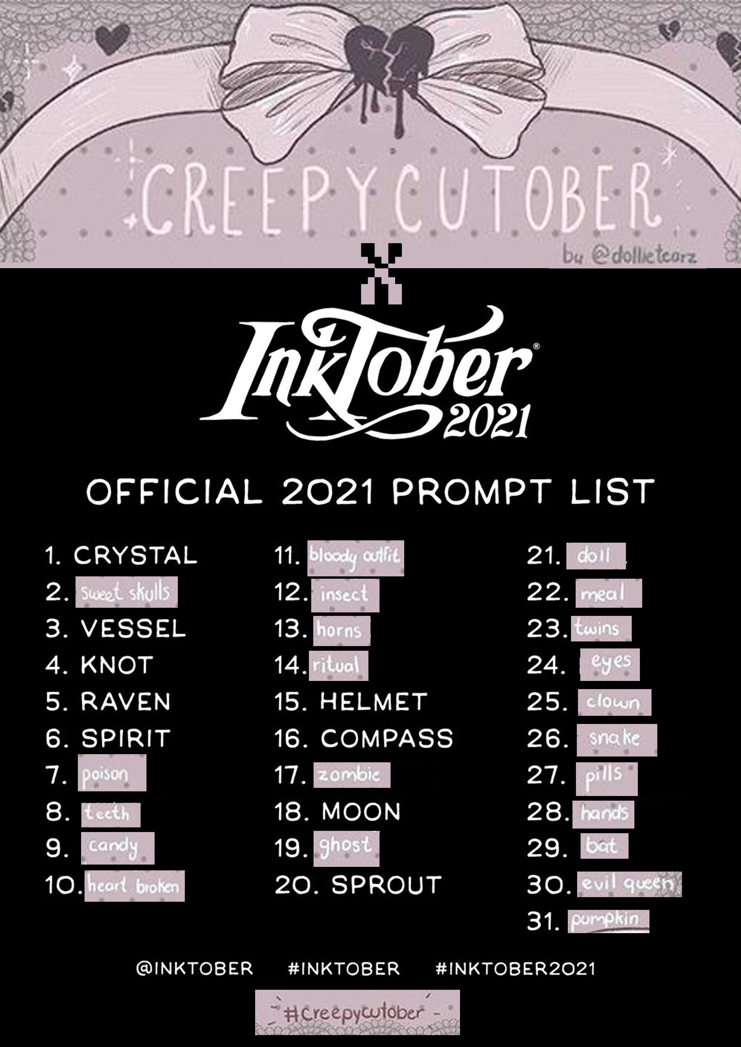 Exact de asta am ales ca anul acesta să folosesc o listă care arată puțin ca monstrul lui Frankenstein (o combinație între lista oficială Inktober și Creepycutober, o listă creată de un utilizator care nu mai poate fi găsit). Astfel am putut să omit cuvintele care nu mă inspirau și să le înlocuiesc cu altele mai potrivite. Am rămas în sfera tradiționalului, însă când a venit vorba de uneltele folosite, adăugând doar un strop de culoare: m-am rezumat la 3 fine-liners negre de diferite dimensiuni, un creion roz, o cariocă roz și o cariocă neagră.
